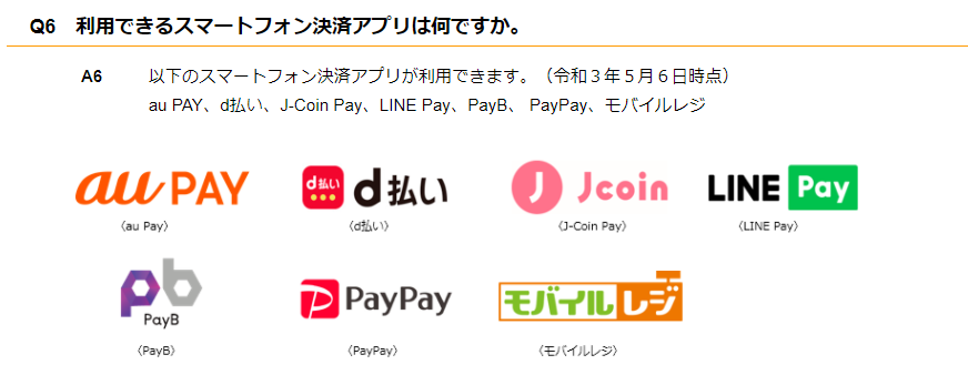 au PAY、d払い、J-Coin Pay、LINE Pay、PayB、 PayPay、モバイルレジ