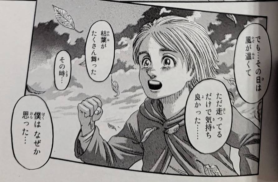 何の生産性もない、誰かの役に立つわけでもない、ただそこにあるだけの「何でもない一瞬」。アルミンは、そういった瞬間のために自分は生まれてきたのではないかと感じた、と語ります。「僕はここに来るために 生まれてきたんじゃないかって…」