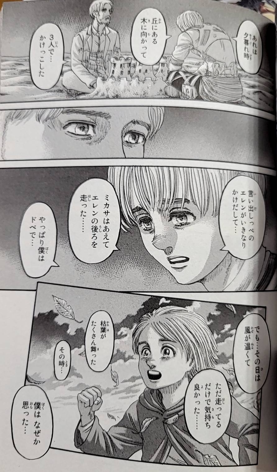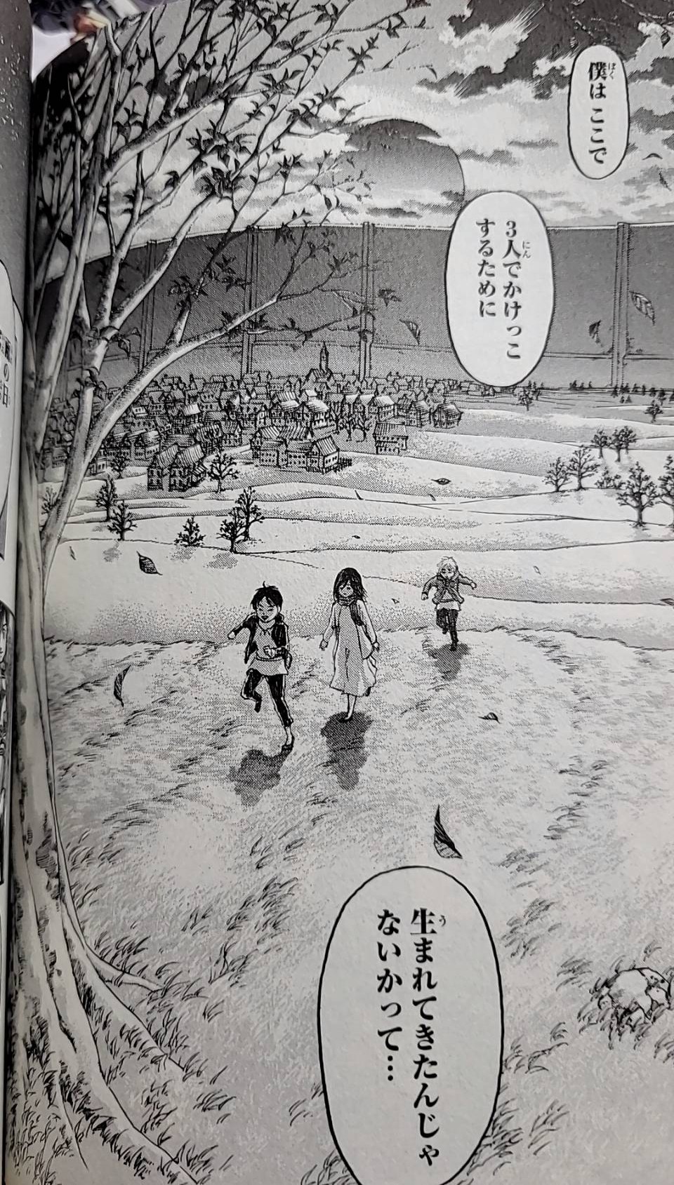 エレン、ミカサと三人で丘の木まで競争した、ただそれだけの日。温かい風、舞い散る枯れ葉、ただ走っているだけで満たされた気持ち…。