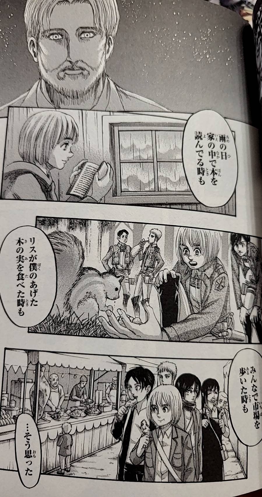 「雨の日に家の中で本を読んでる時も… リスが僕のあげた木の実を食べた時も… みんなで市場を歩いた時も…」