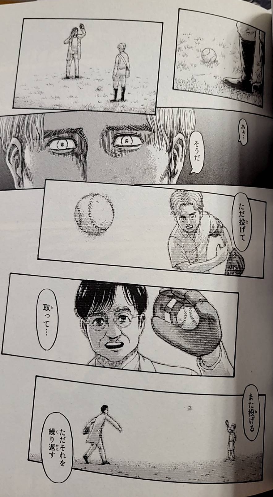 ジークにとっても、そんな瞬間がありました。それは、先代の獣の巨人クサヴァーさんと、ただひたすらにキャッチボールを繰り返した日々。
